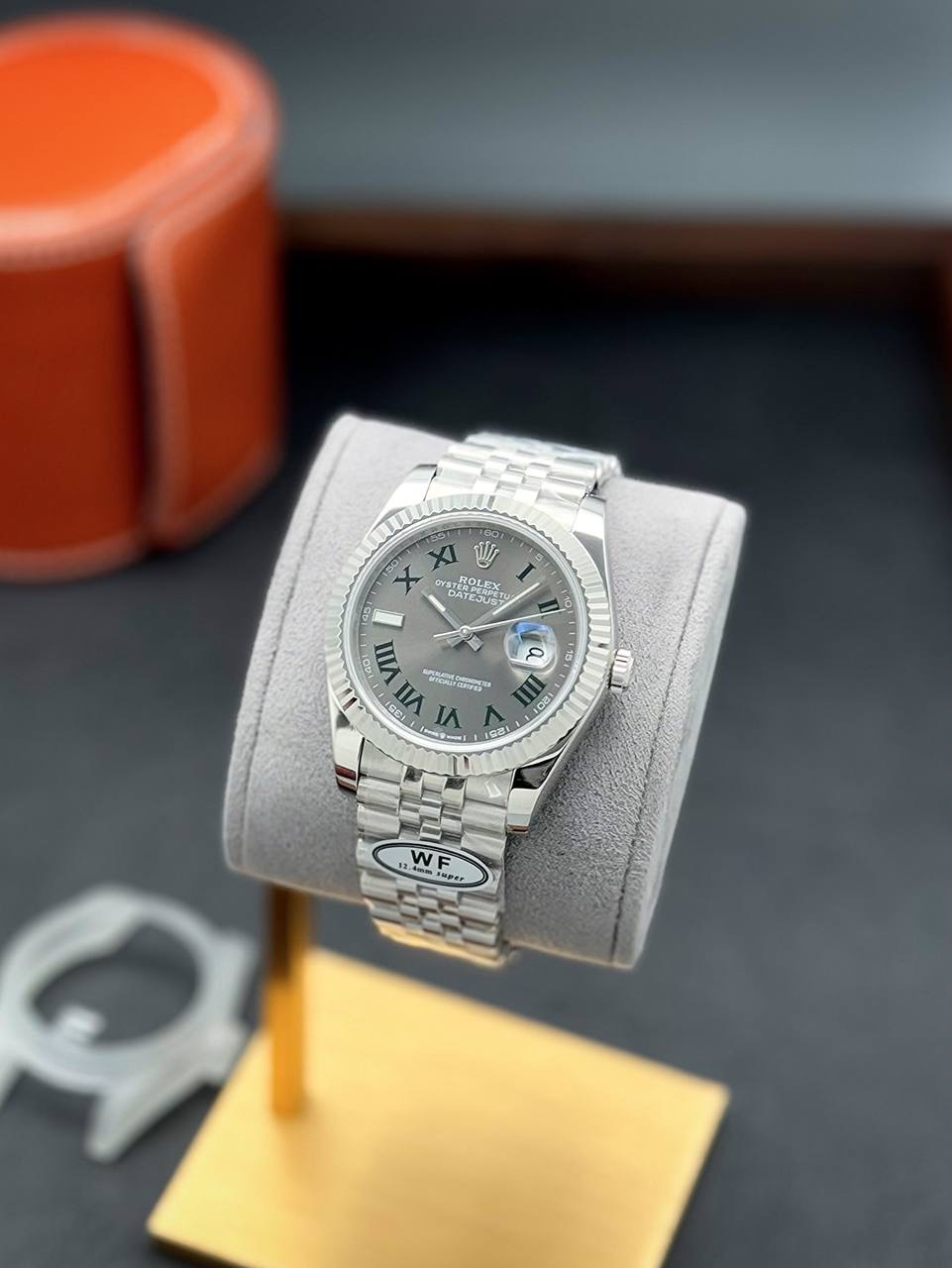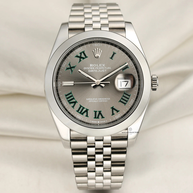 قاب دایرهای Datejust با بزل کنگرهدار (Fluted) یکی از فوریترین سیلوئتها برای شناسایی است. شیارهای منظم حاشیه قاب، نور را از زوایای مختلف میشکنند و بدون هیچ نگین یا المان اضافهای، درخشش کنترلشدهای به ساعت میدهند. پنجره تاریخ در موقعیت ساعت ۳ با لنز بزرگنمایی برجسته، امضای بصری این مدل است. صفحه در رنگهایی مثل آبی، نقرهای، مشکی، زیتونی و طرح شناختهشده ویمبلدون عرضه میشود و اندکسها بسته به نسخه، خطی، رومی یا نگیندار هستند.