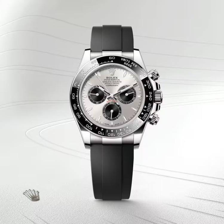 دو پوشر پیچی در دو طرف تاج کوک، المانهایی هستند که Daytona را از هر ساعت سهموتوره دیگری متمایز میکنند. فرمشان ارگونومیک است و حس فشردنشان مکانیکی و قاطع. بند استیل یا رابر — بسته به نسخه انتخابی — هرکدام کاراکتر متفاوتی به ساعت میدهند: استیل برای ظاهر اسپرتلوکس، رابر برای حس سبکتر و ورزشیتر.