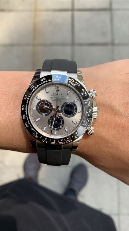 روی مچ، Daytona حضوری متفاوت از مدلهای کلاسیک دارد. ضخامت قاب و برجستگی پوشرها حس ابزار دقیق را منتقل میکنند، اما اندازهاش آنقدر کنترلشده هست که زیر سرآستین جا بگیرد. وقتی انگشتتان روی پوشر بالایی مینشیند و عقربه کرنوگراف شروع به حرکت میکند، حسی ملموس از مکانیزم زنده زیر شیشه دارید — حسی که ساعتهای سادهتر نمیتوانند تکرارش کنند.