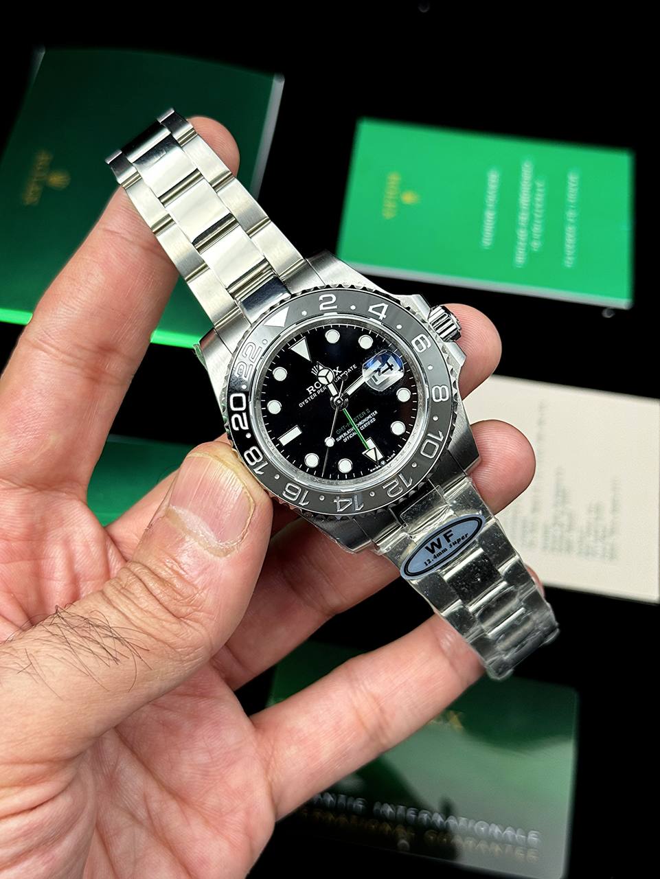 رپلیکا ایتالیا: فولاد 904L، وزن و ضخامت مشابه نسخه اصلی، موتور اتوماتیک با ۲۴ تا ۳۶ ساعت پاور رزرو، شیشه سافایر مشابه اصل، مقاوم در برابر آب تا عمق ۱۰ متر. برای کسی که دقت رنگ بزل، عملکرد عقربه GMT و نزدیکترین تجربه به نسخه اصلی برایش اولویت دارد.