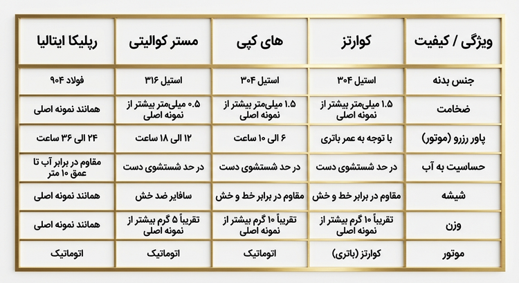 مستر کوالیتی: استیل 316L، موتور اتوماتیک با ۱۲ تا ۱۸ ساعت پاور رزرو، شیشه سافایر ضدخش، ضخامت ۰.۵ میلیمتر و وزن حدود ۵ گرم بیشتر از اصل، مقاوم در برابر آب در حد شستشوی دست. نقطه تعادل مناسب بین کیفیت ساخت و بودجه؛ برای استفاده روزمره و سفرهای کاری.